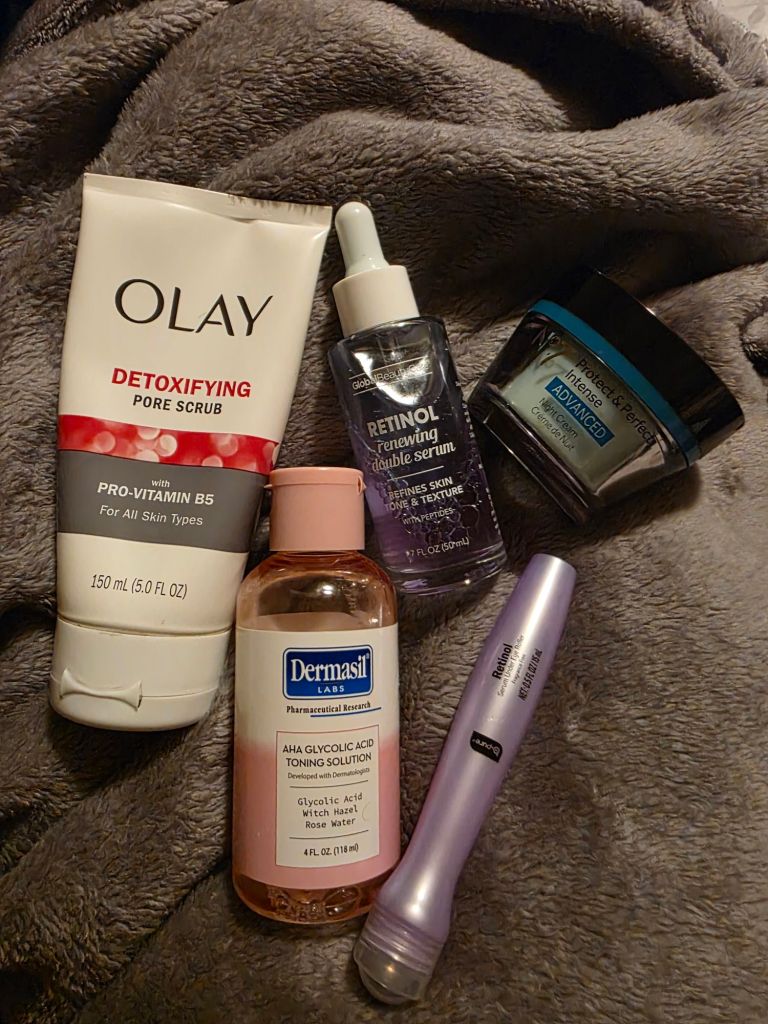 I used the Detoxifying Pore Scrub by Olay, my current go to Toner by Dermasil (Purchased at the Dollar Tree ), I’m trying this Retinol serum (another Dollar Tree find), and this No7 Night Creme is an old favorite (I’ve tried a few of their skin care sets and my skin responded really well each time). I closed it out with the Retinol Serum Under Eye Roller (another Dollar Tree find).