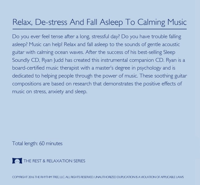 The CD was actually composed and recorded by a board certified music therapist with a master’s degree in psychology. The guitar medleys play over ocean sounds that continue throughout the entire CD and between tracks so there aren’t any breaks or silence between songs. For added relaxation, all of the tracks are played at the rhythm of the resting heart rate.