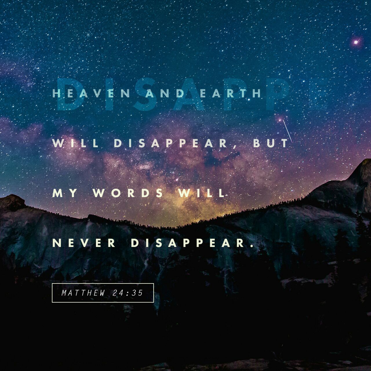 Image Verse of the Day on March 5, 2017 Heaven and earth will disappear, but my words will never disappear. Matthew 24:35 NLT http://bible.com/116/mat.24.35.NLT Share this:TweetLike Loading... Related