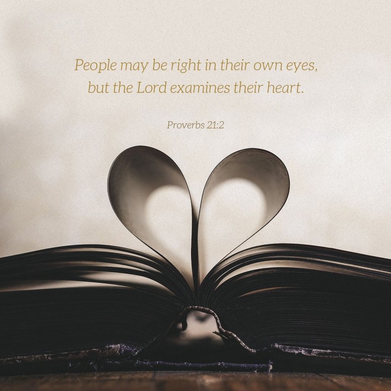 People may be right in their own eyes, but the Lord examines their heart. Proverbs 21:2 NLT