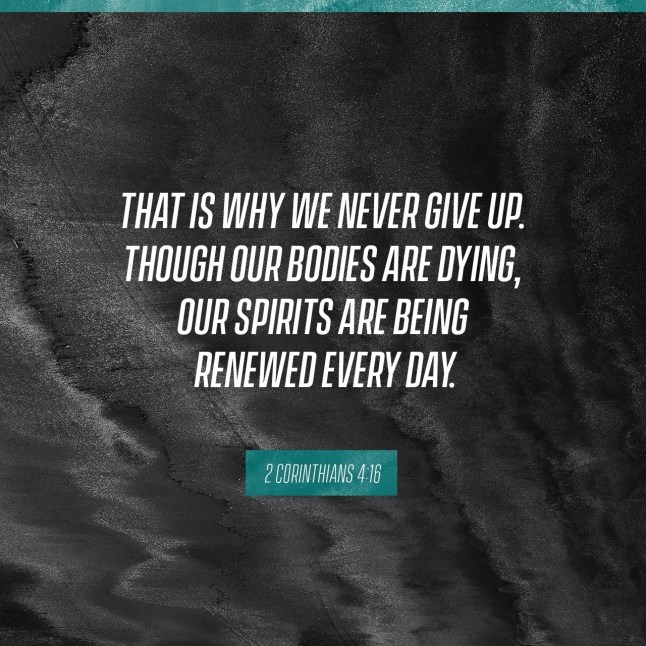Therefore we do not become discouraged (utterly spiritless, exhausted, and wearied out through fear). Though our outer man is [progressively] decaying and wasting away, yet our inner self is being [progressively] renewed day after day.