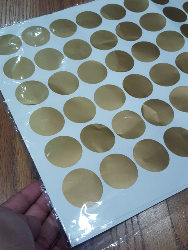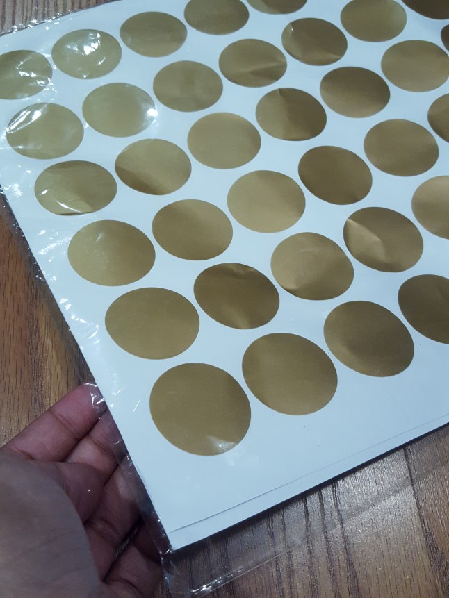 Next, I used these gold dots to give the ribbon a cleaner look. It hides all of the knots that I made to get a “fuller looking” bow.